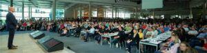 Peter Bostelmann teaching mindfulness skills to a large group of SAP employees. Every year, SAP puts over 2,500 employees through SIY’s signature mindfulness-based emotional intelligence programs.